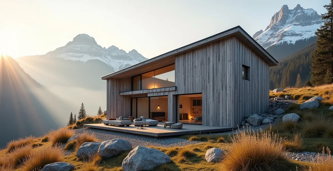 L’architecture alpine contemporaine connaît une tendance forte : la réinterprétation des formes traditionnelles avec des lignes épurées. Le toit à deux pans, archétype du chalet, est ainsi souvent revisité dans une version sans aucun débord. Le résultat est un volume monolithique, d’une grande pureté esthétique, où le bardage des murs semble se prolonger jusqu’à la toiture. Si ce choix architectural est séduisant, il représente un défi technique majeur, particulièrement en climat de montagne. L’absence de débord de toit supprime la protection la plus efficace de la façade contre la pluie et la neige.